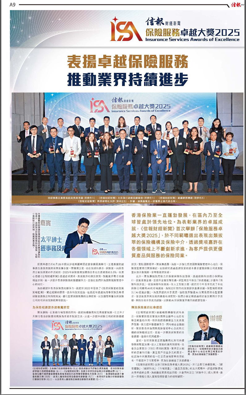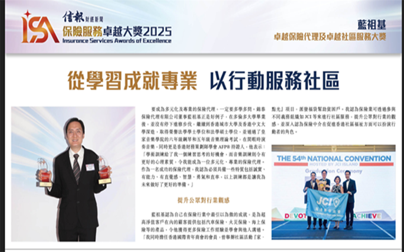 《信報財經新聞》首屆【保險服務卓越大獎】卓越保險代理及卓越社區服務